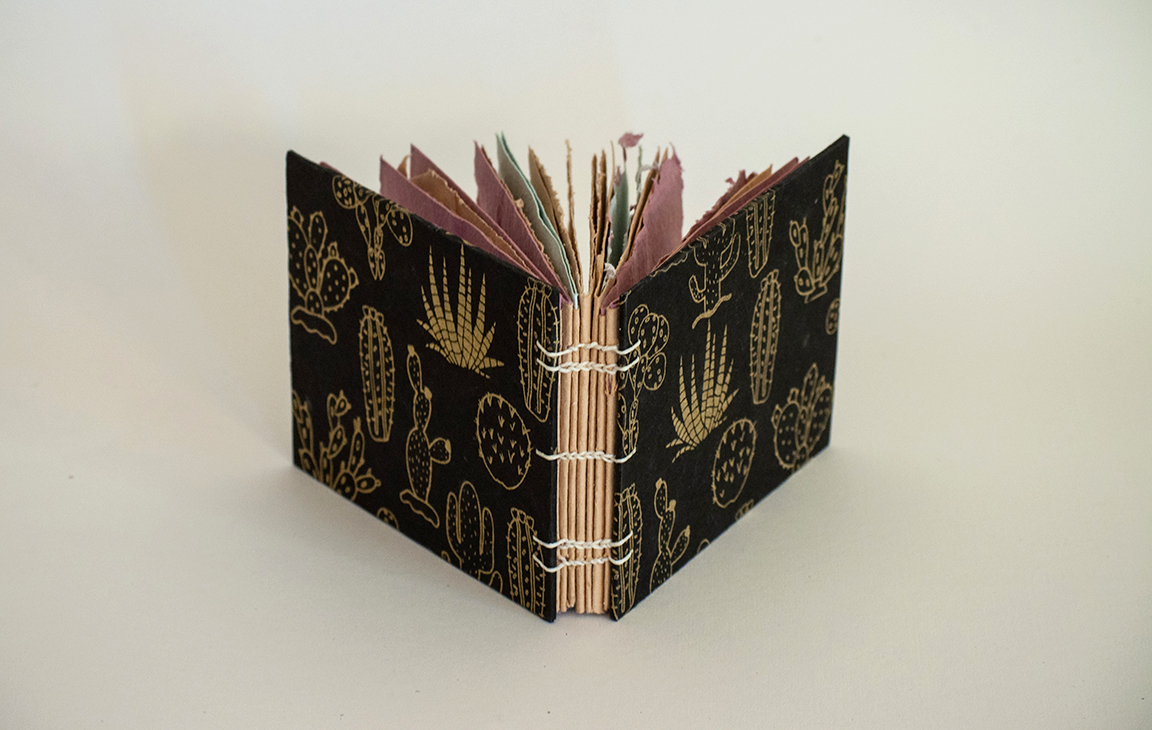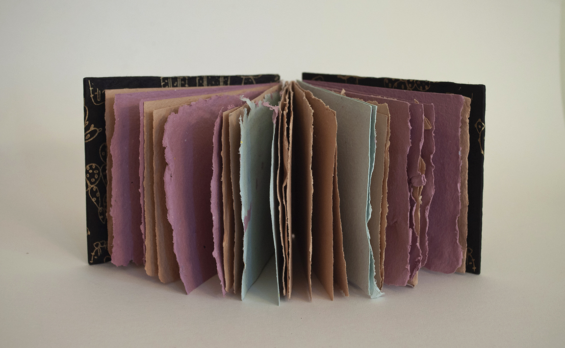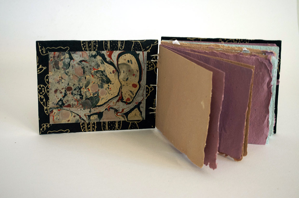 Book made with handmade papers, handmade marbled end papers, with a decorative cover paper, and a coptic stitch.