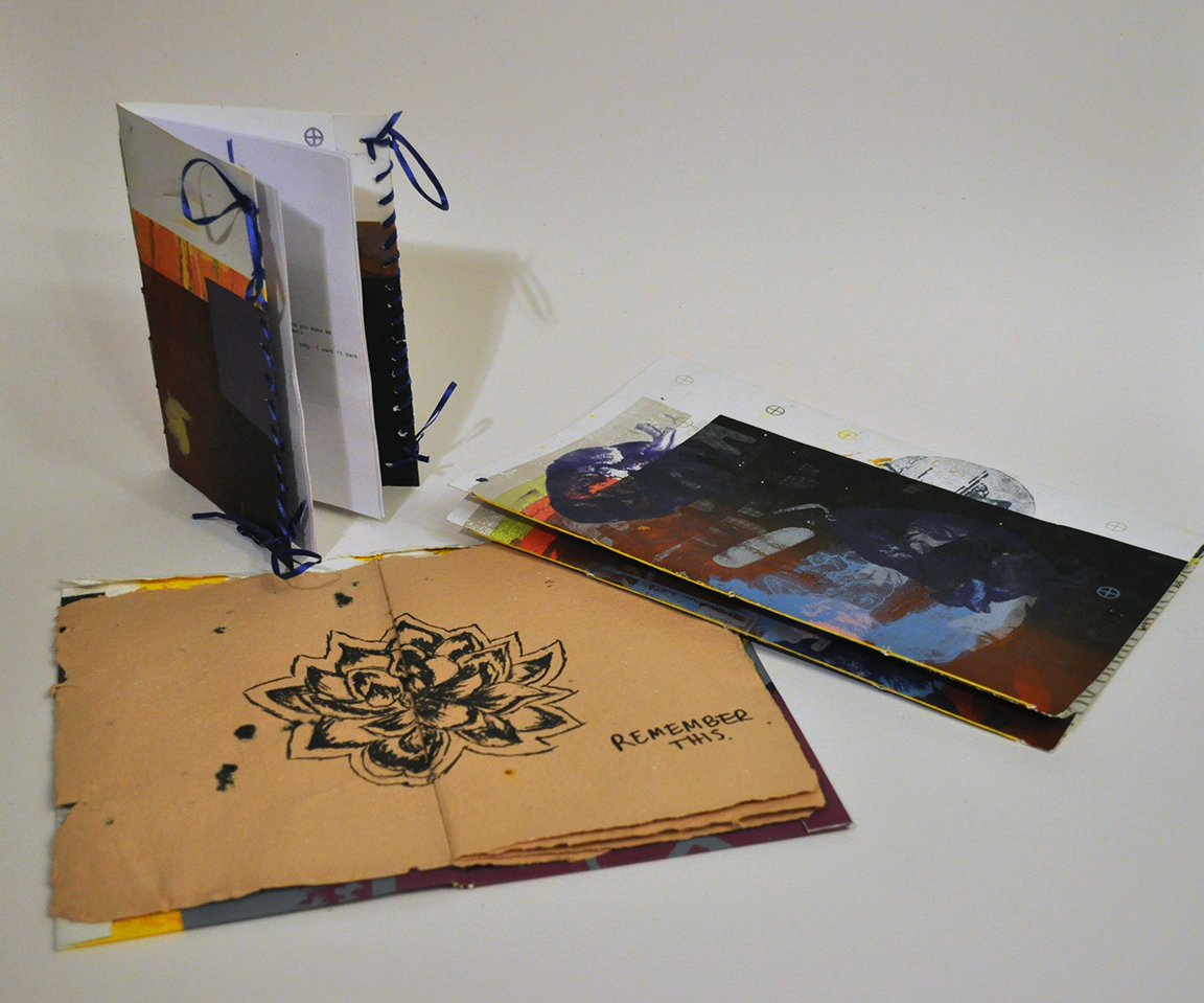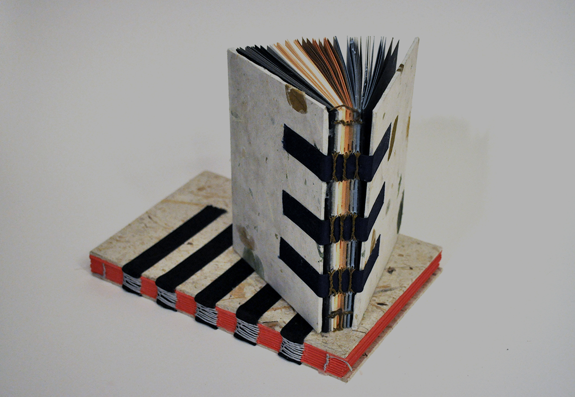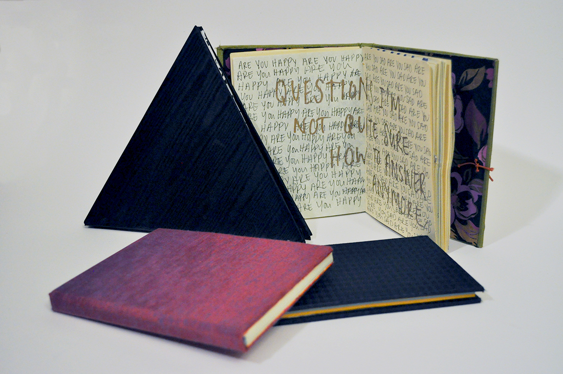 Three books bound with pamphlet stitches. Open book also contains handmade paper and persona illustrations, while book on far right has a double pamphlet stitch.
