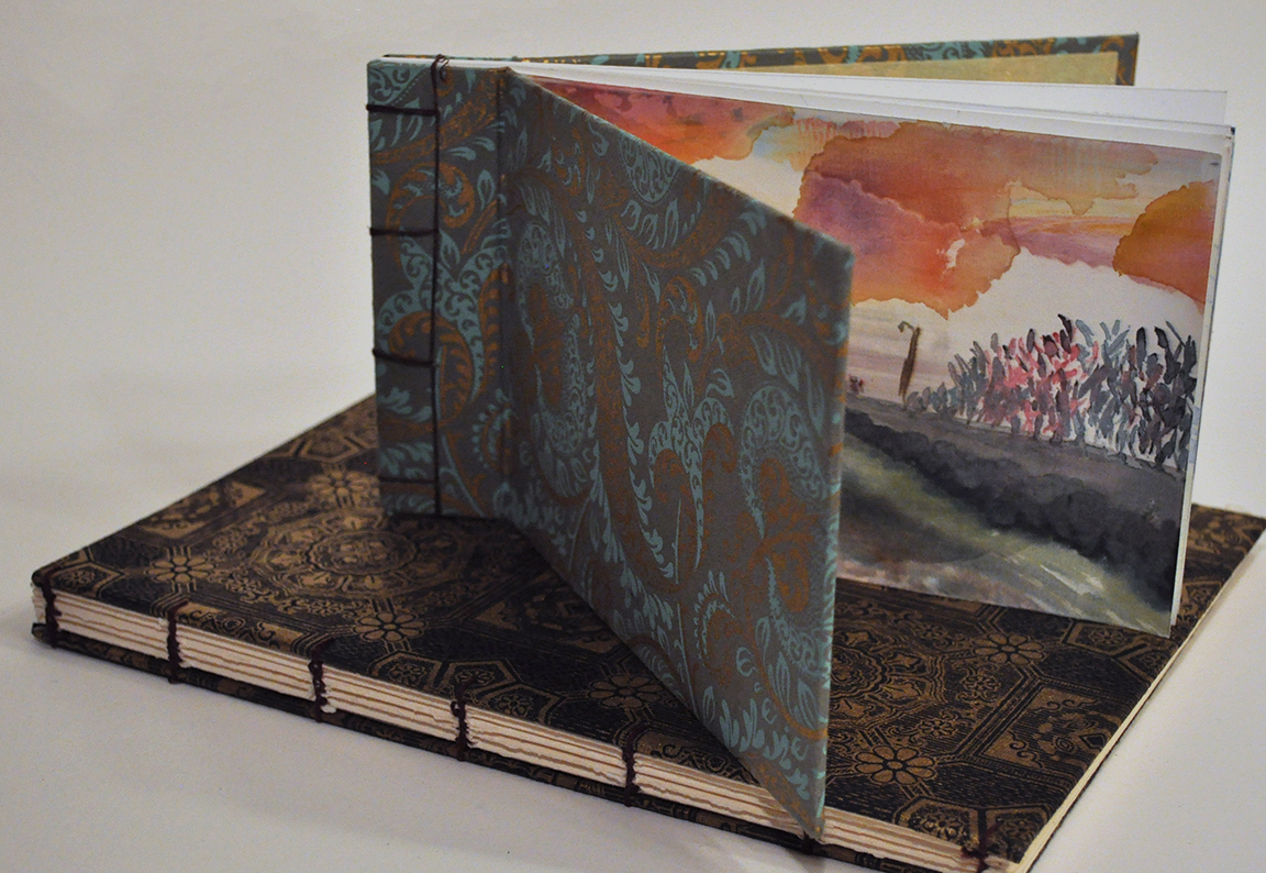 A coptic stitch sketchbook on the bottom, and a Japanese stab bound book on the top containing watercolor screen prints.